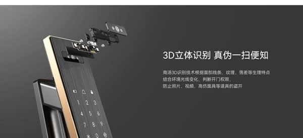 超大廣角的商湯3D人臉識別攝像系統能夠根據用戶的面部輪廓、線條、紋理等生理特點,結合光線變化,判斷用戶開門權限,有效拒絕照片、視頻、仿真面具等道具試開,安全升級。