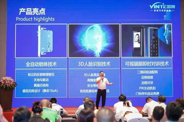 會上,產品策略部高級經理黃培強先生隆重發布了T8F-3D人臉識別智能鎖、Z1-指靜脈智能鎖、石墨烯電熱毛巾架等多款引爆市場的重磅新品。