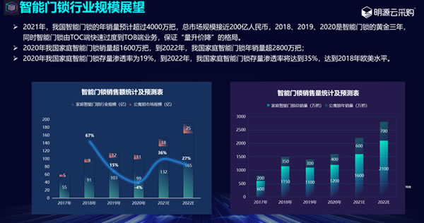 預(yù)計到2022年,我國家庭智能門鎖銷量將超2800萬把,其滲透率也將遠(yuǎn)超2020年的19%,將達(dá)到35%,接近歐美水平。