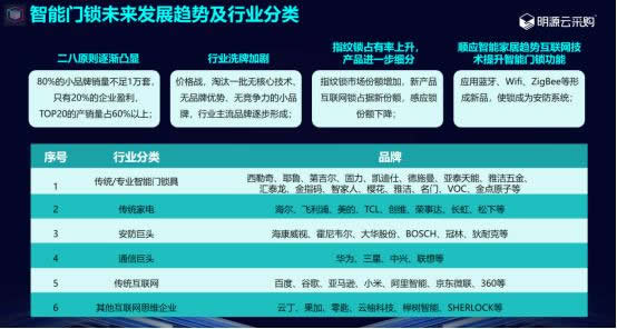 不同于公寓鎖市場,家庭鎖市場包含互聯(lián)網(wǎng)廠商、傳統(tǒng)鎖具廠商、家電巨頭和電子巨頭廠商以及安防廠商。