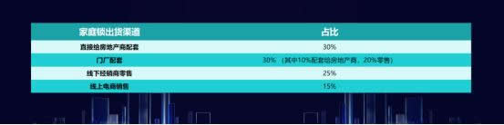 如圖所示,在家庭鎖出貨渠道中,各渠道占比分別為:直接給房地產(chǎn)商配套占比達(dá)30%;門廠配套占30%(其中10%配套給房地產(chǎn),20%給零售);線下經(jīng)銷商零售占25%,線上電商銷售占15%。